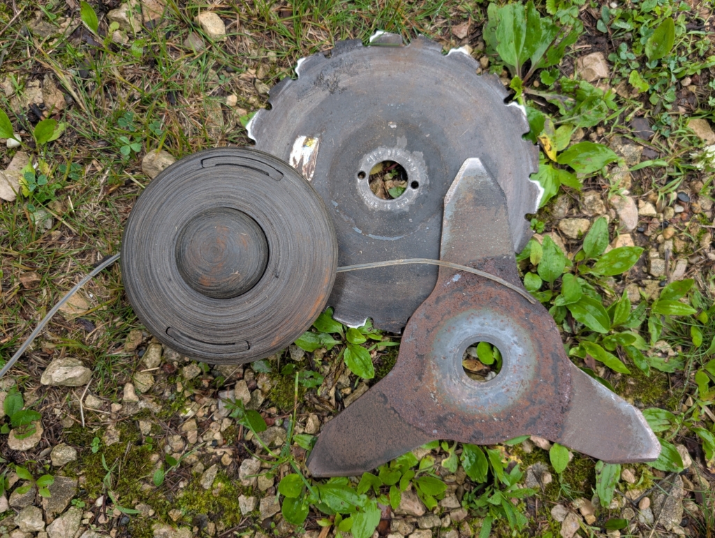 Brush-cutters are basically ‘string-trimmers’ outfitted instead with steel blades or circular saw blades rather than string. There are a number of different blade types available, and they each have their varying strengths in slightly different vegetation types. The round, saw-toothed, blade types are handy for somewhat larger, multi-stemmed, solidly woody shrubs. The type that I usually have on my machines we call the tri-blade. The tri-blade option is a good fit when you are cutting through some taller grasses, some stemmy weeds, and the occasional woody shrub.